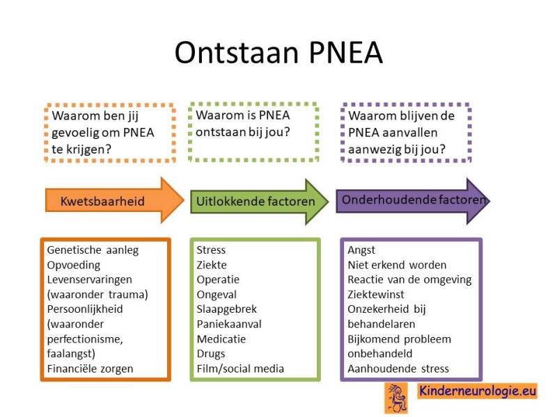 PNEA komt zowel bij volwassenen als bij kinderen voor. Wanneer zij moeite hebben met het uiten van emoties, moeilijk kunnen praten over hun gevoelens en deze niet met andere mensen kunnen delen, dan veroorzaken die emoties spanning die opgeslagen wordt in het lichaam. Vaak stapelt die spanning zich in de loop van de tijd op, totdat die zo groot wordt dat het lichaam de spanning niet meer kan verbergen en deze er uit komt. De aanvallen zijn een serieus signaal dat er hulp nodig is om met de spanningen, angst en onrust om te kunnen gaan.